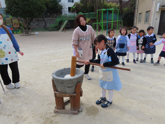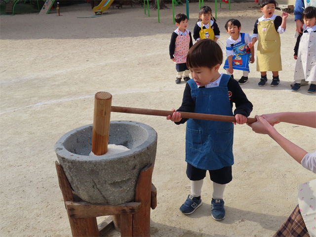 火をおこし、もち米を蒸しているときの匂い、石臼と杵・・・と昔ながらのおもちつきを今年もみんなでぺったんぺったんつきました。