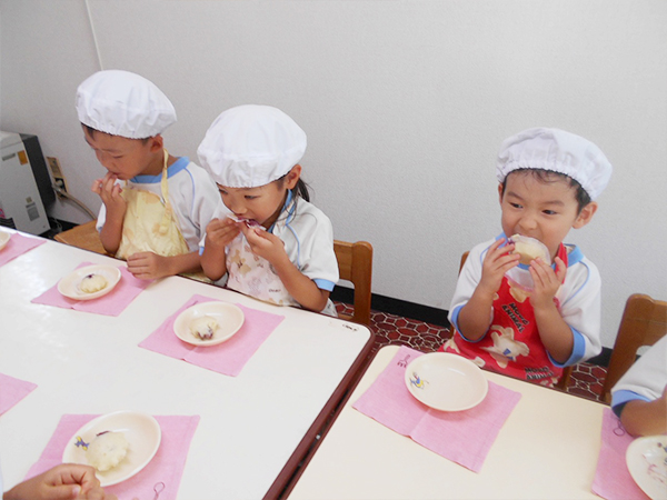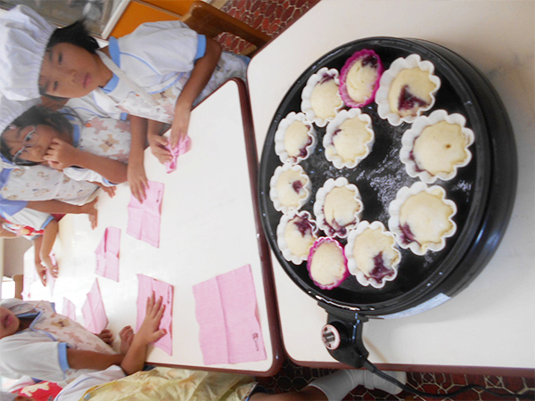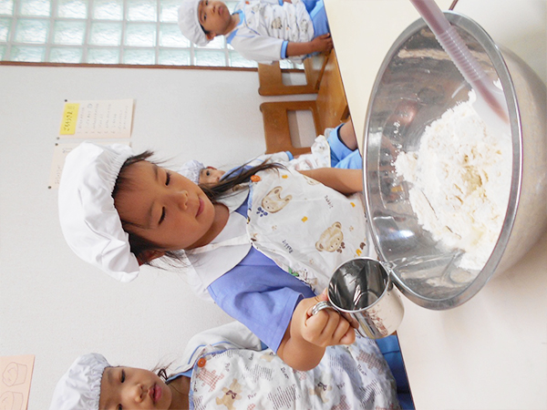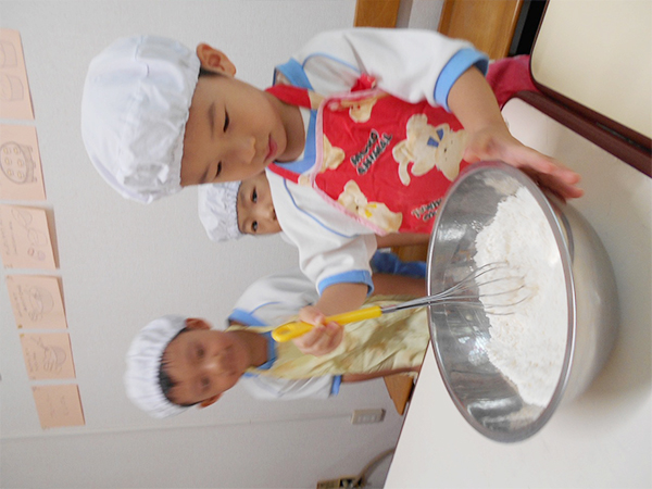 お兄さん、お姉さんに教えてもらいながら、蒸しパン作り。