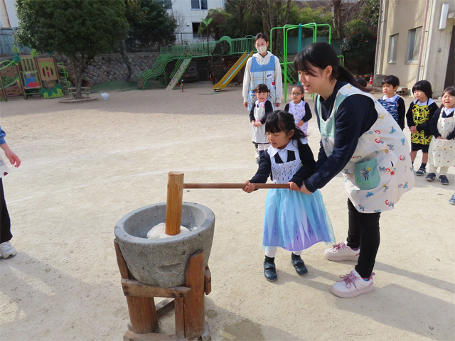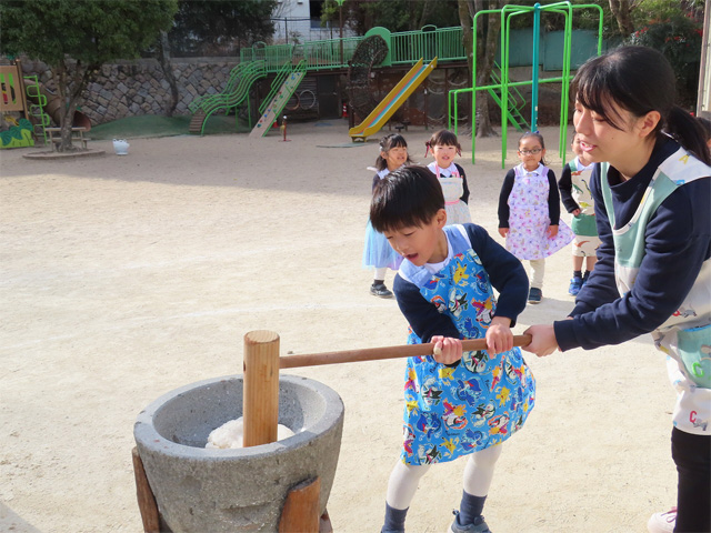 火をおこし、もち米を蒸しているときの匂い、石臼と杵・・・と昔ながらのおもちつきを今年もみんなでぺったんぺったんつきました。